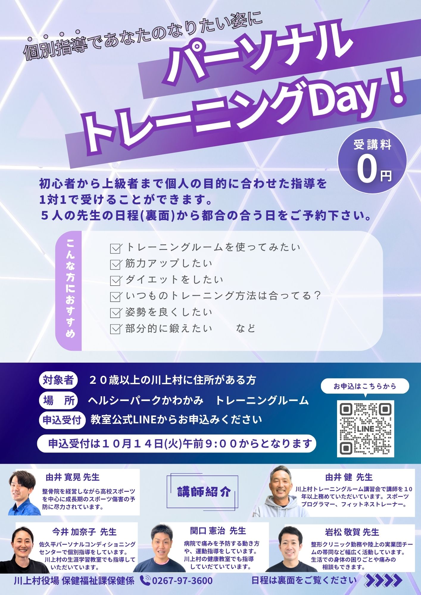 ヘルシーパークかわかみ2階トレニンーグルームにおいて、パーソナルトレーニングを実施します。