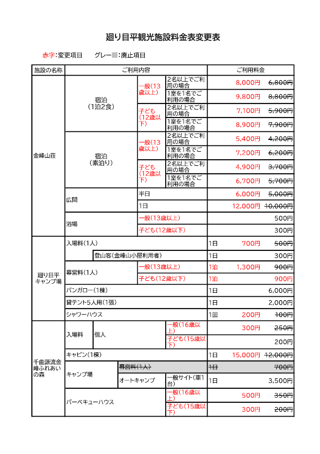 利用者の皆さまへのより良いアウトドア環境を提供するため、令和8年4月1日より、廻り目平観光施設(金峰山荘、廻り目平キャンプ場、ふれあいの森 等)の利用料金を改定させていただきます。