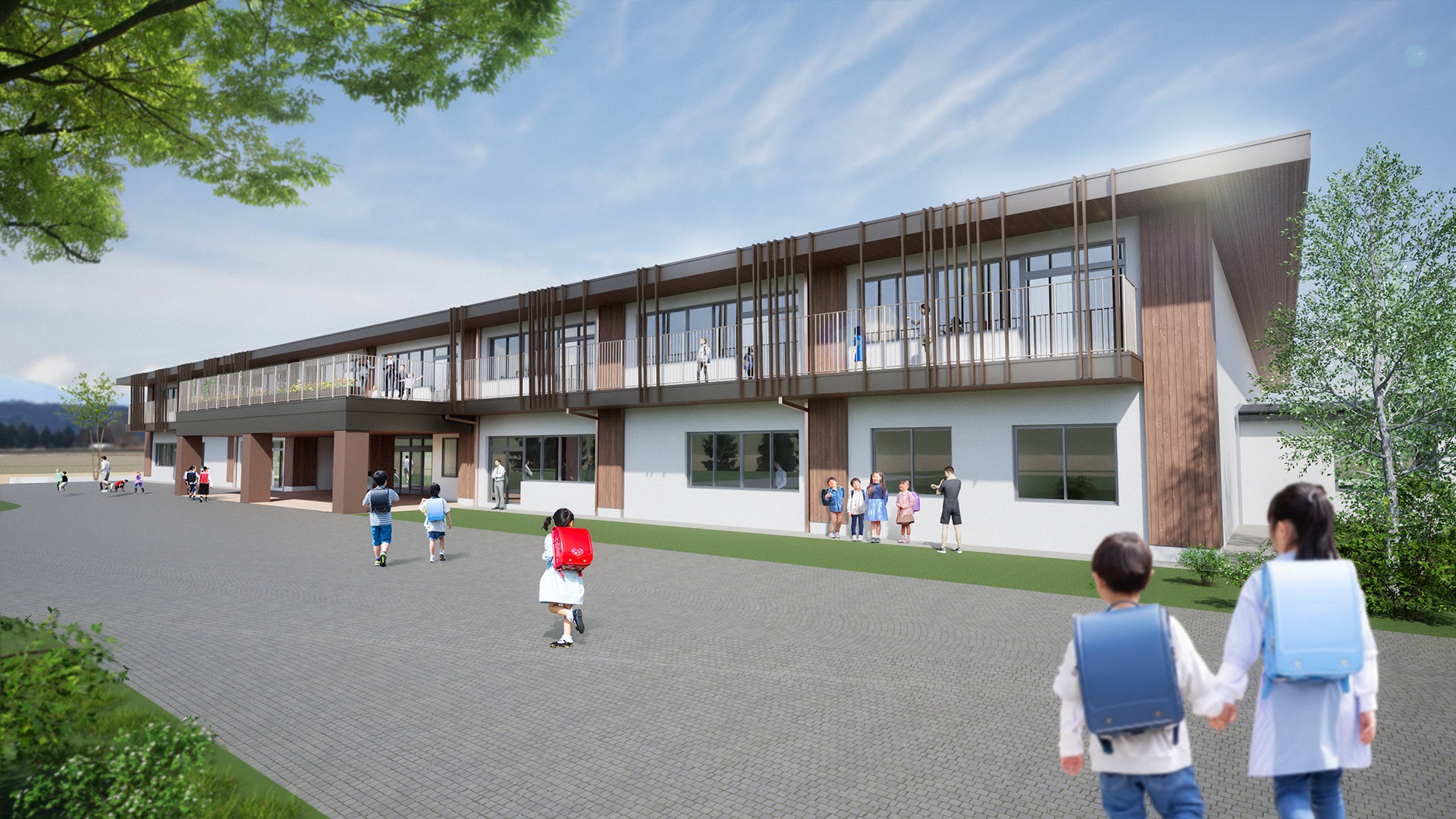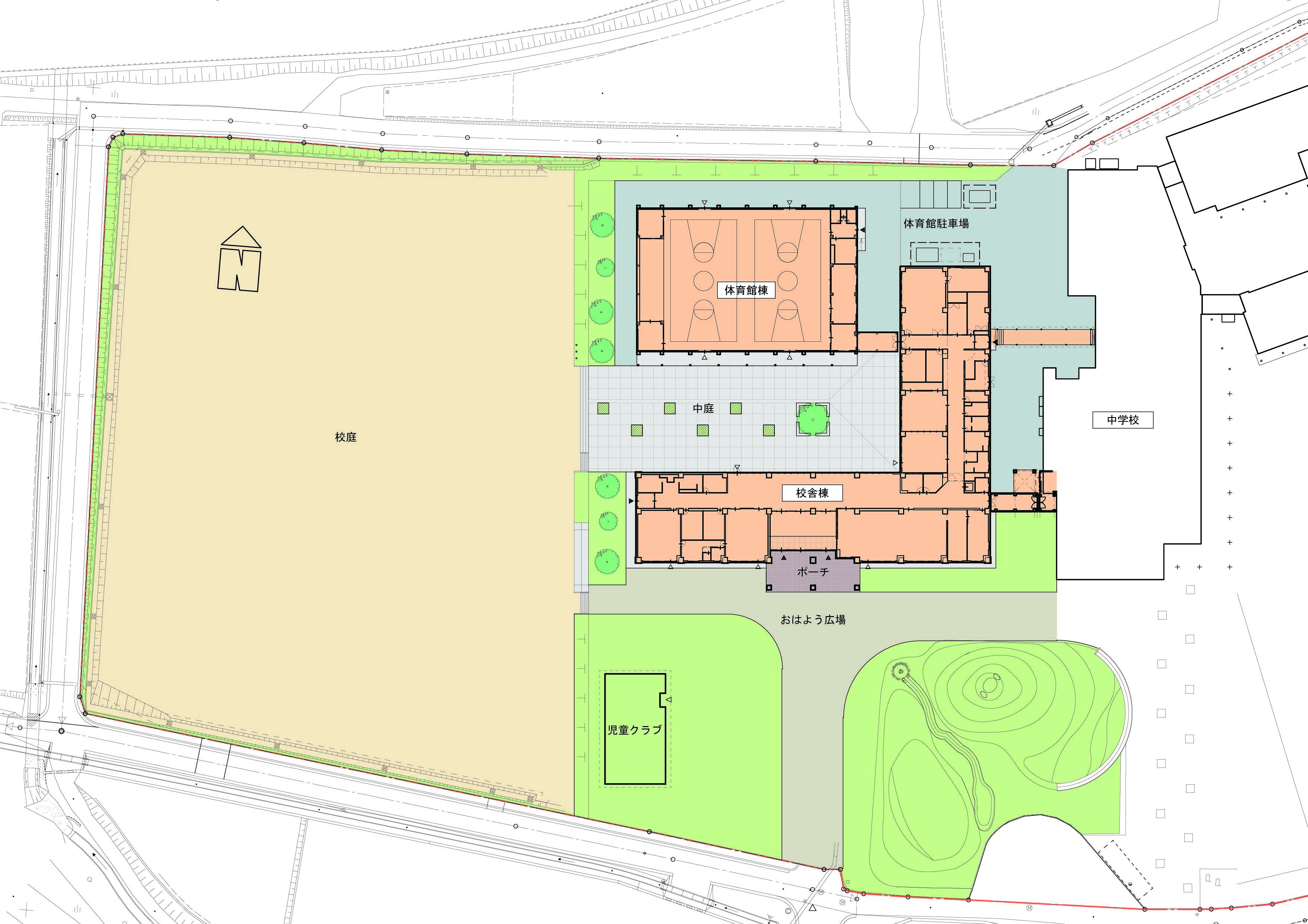 中学校との接続:1階に中学校連絡口および屋外渡り廊下を設け、中学校校舎との円滑な往来が可能な計画としています。