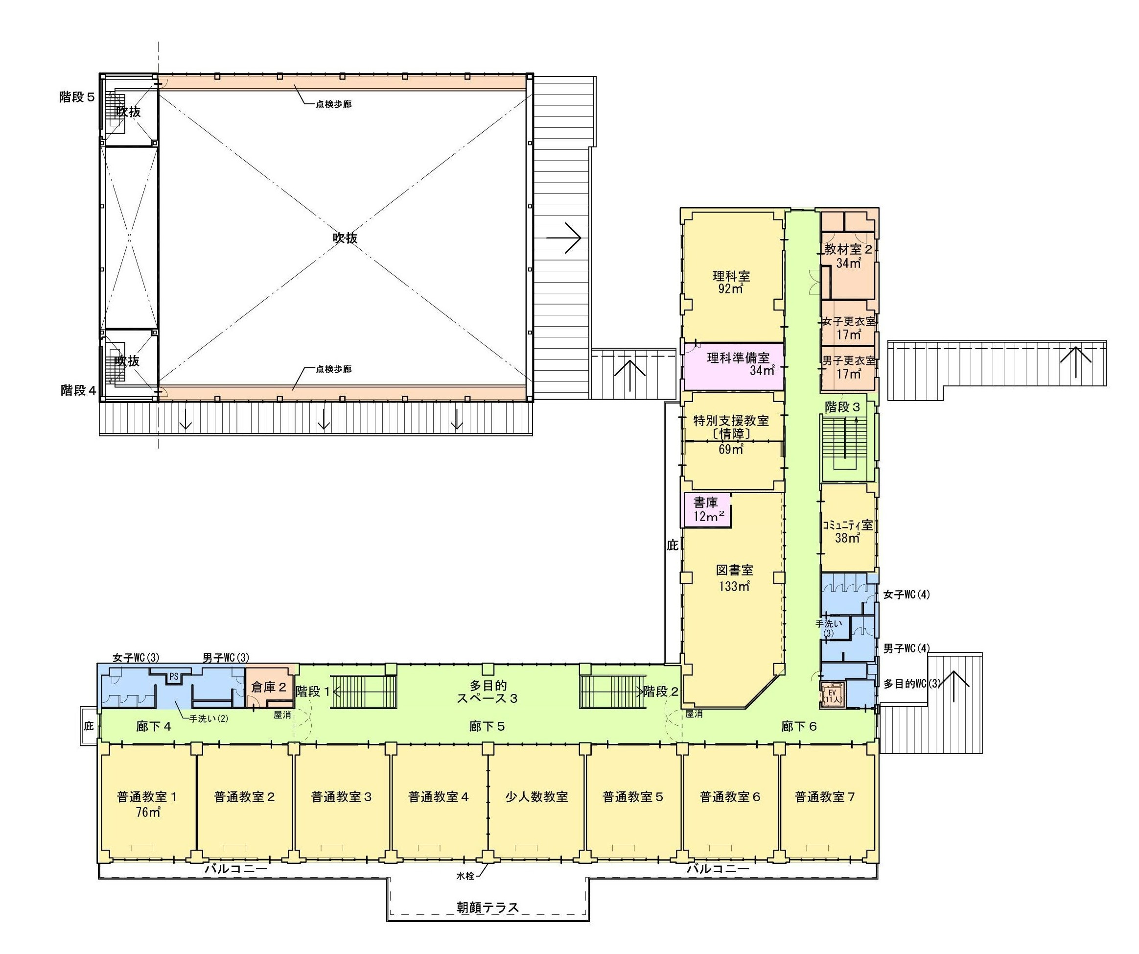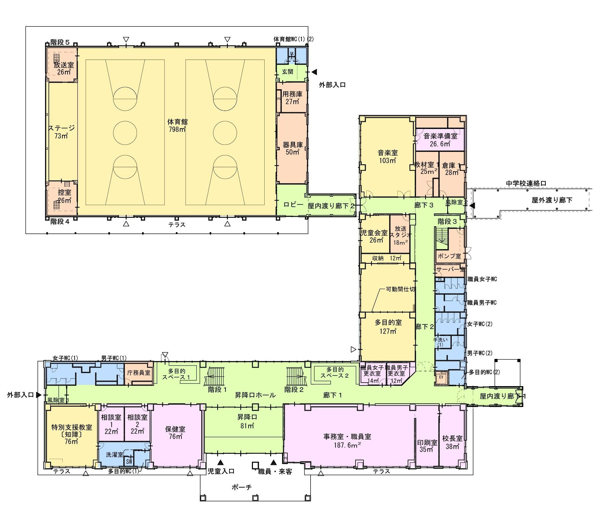 バリアフリーへの配慮:エレベーター(EV)の設置や多目的トイレの配置により、車椅子利用者や介助が必要な児童にも配慮した設計としています。
